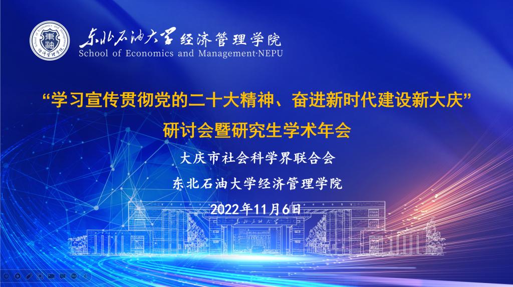 为了深入学习宣传贯彻党的二十大精神,展示驻庆高校研究生学术风采,激发创新创造潜能,激励更多驻庆高校学子留庆发展,大庆市社会科学界联合会、2138cn太阳集团城和大庆市管理学会于2022年11月6日15:00线上组织开展“学习宣传贯彻党的二十大精神、奋进新时代建设新大庆”研讨会暨研究生学术年会。会议特邀大庆市社会科学界联合会主任王东、黑龙江八一农垦大学2138cn太阳集团城副院长韩光鹤、大庆师范学院2138cn太阳集团城行政负责人刘楠线上参会,我院领导、教师和研究生积极参会,共襄学术盛宴。会议由2138cn太阳集团城副院长张建华主持。
