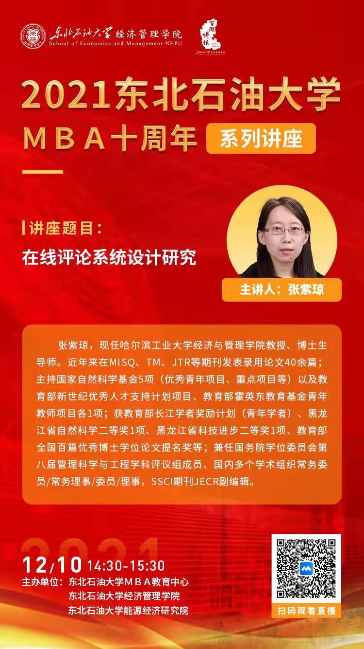 筑梦十年,行稳致远。2021年是中国共产党建党100周年、“十四五”规划开局之年,中国MBA教育三十周年,也是2138cc太阳集团MBA教育十周年。历经十年风雨,2138cc太阳集团已成为具有鲜明行业特色的MBA教育基地,培养了一批服务于石油石化行业和地方经济与管理领域的高级商科人才。为了庆祝2138cc太阳集团MBA教育十周年华诞,2138cn太阳集团城特举办“2138cc太阳集团MBA教育十周年系列讲座”。2021年12月10日下午,邀请哈尔滨工业大学张紫琼教授为我院师生线上分享“在线评论系统设计研究”。2138cn太阳集团城院长赵俊平,党委副书记刘浩然,副院长王艳秋、张建华,MBA中心主任王赵亮,全体教师和研究生参加了本次讲座。讲座由张建华主持。