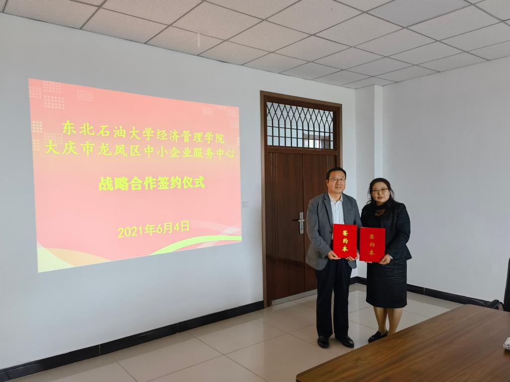 2021年6月4日下午,我院与大庆市龙凤区中小企业服务中心战略合作签约仪式在经管院中型会议室举行。院长赵俊平、副院长王艳秋、各系主任及副主任代表、大庆市龙凤区中小企业服务中心主任杨波、副主任赵文婷出席本次签约仪式。