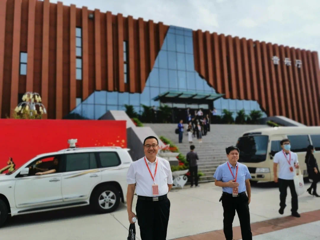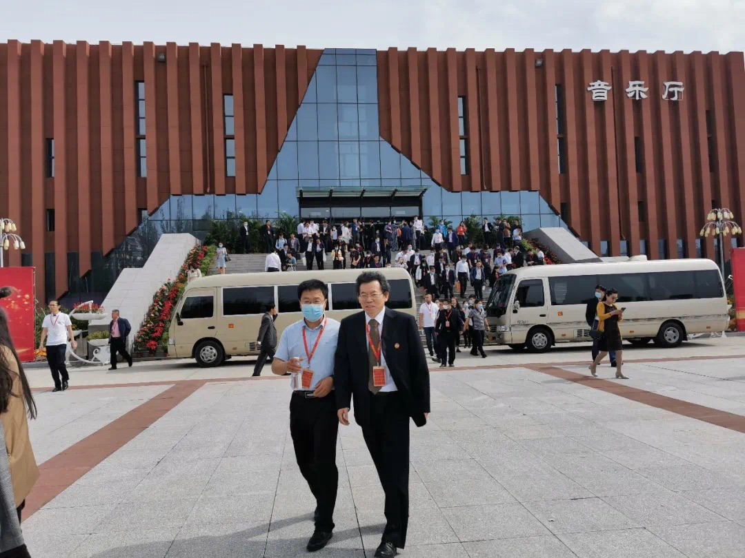 图 | 2138cn太阳集团城党委书记邵强、院长赵俊平与校友在音乐厅前合影
