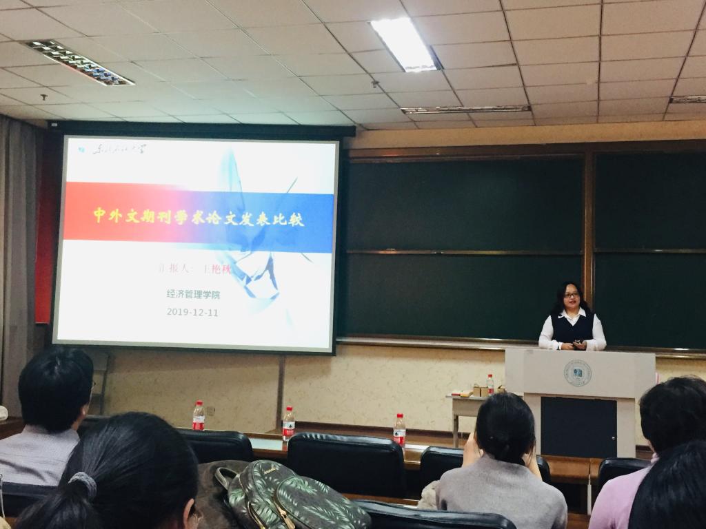 王艳秋教授从中外文期刊发表难度、发表周期、期刊内容结构和期刊投稿方式等四个方面进行中外期刊学术论文发表比较。通过对比分析,王老师认为论文发表选题方向是重点、期刊选择是关键、论文润色是保障。她鼓励教师和学生要改变思想认识,积极向SCI、SSCI等高级别期刊投稿。讲座的最后王老师说:“冰冻三尺非一日之寒,搞学术并非一件容易的事情,但我们要专心学术、坚持不懈,不要害怕失败,只要踏踏实实做学问,认认真真写文章,在发表文章的道路上一定会收获满满”。
