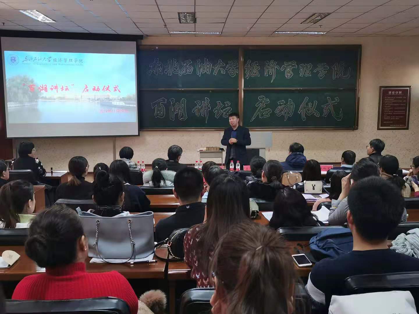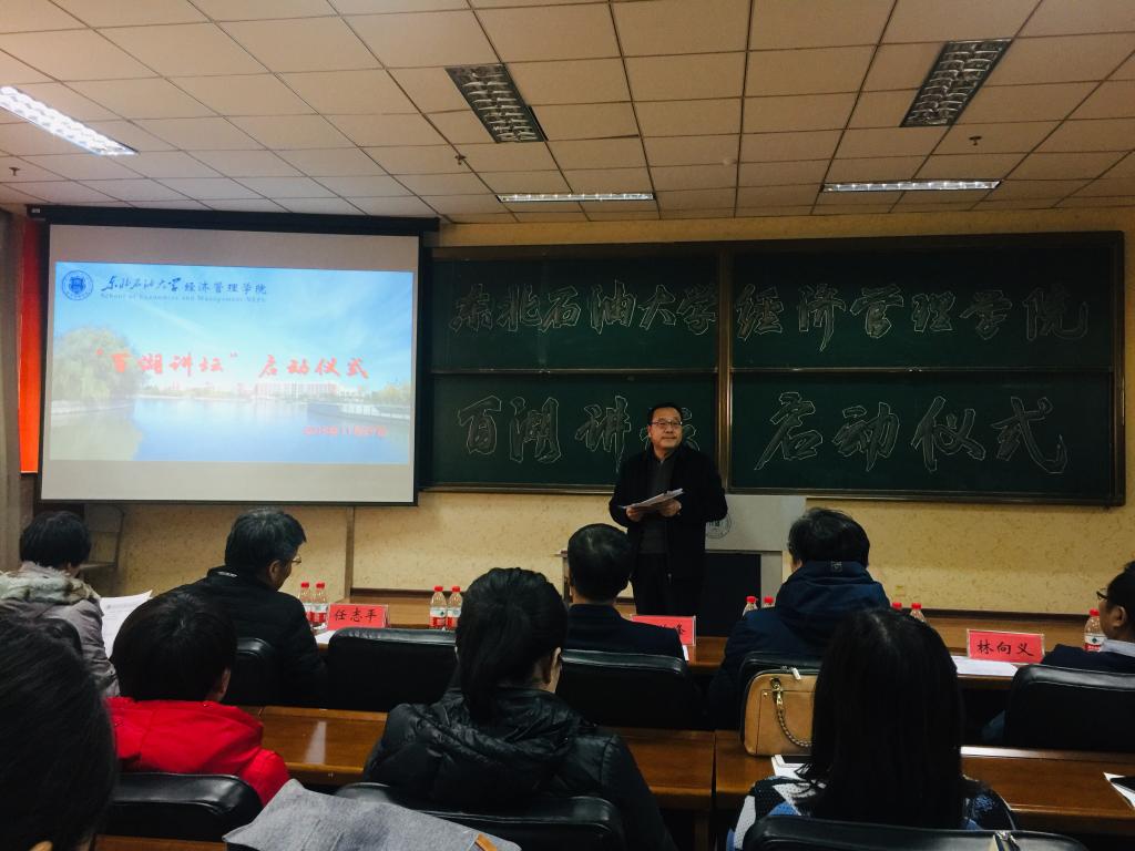 接着,高洪峰对“百湖讲坛”的顺利启动表示祝贺,对通过讲坛的形式进行学术交流、活跃学术氛围给予了充分肯定,对经管院“百湖讲坛”举办100期充满信心,也希望经管院长期坚持,把“百湖讲坛”打造成2138cc太阳集团特色学术品牌。高洪峰也鼓励青年教师持续关注科技创新问题、资源型城市转型问题和龙江经济发展问题,为服务地方经济做出更大的贡献。