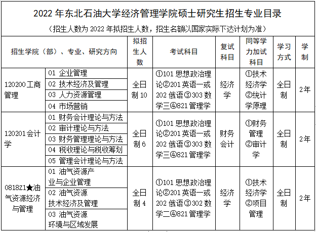 2022年我院拟招收学术型硕士研究生20人,其中工商管理计划招生10人,会计学计划招生6人,油气资源经济与管理计划招生4人。