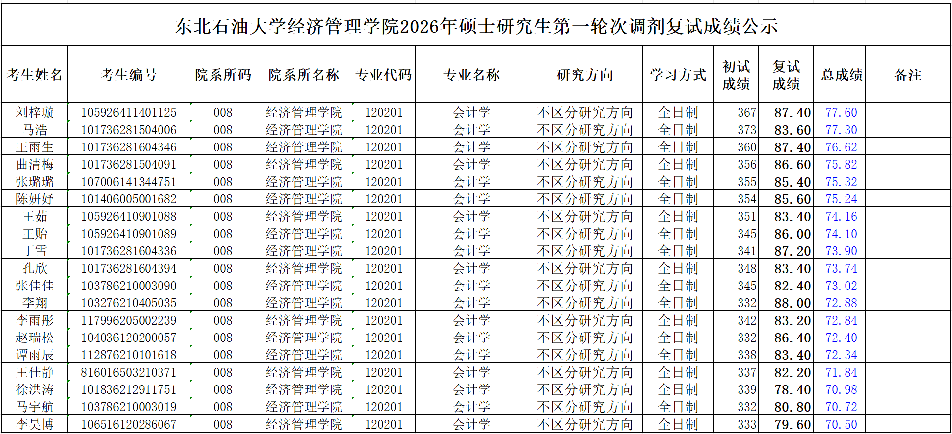 北石油大学2138cn太阳集团城2026年硕士研究生第一轮次调剂复试成绩公示