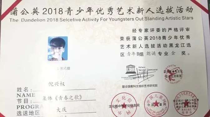 蒲公英2018青少年优秀艺术新人选拔活动黑龙江选区青年B组朗诵专业金奖